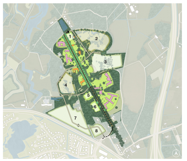 Een deel van de zorg blijft in het gebied. Historische gebouwen, zoals de oude villa’s en de kerk, blijven behouden. De hoofdentree krijgt een belangrijke rol. Een laan met bomen leidt naar de historische gebouwen, die toegankelijk zijn voor publiek. Hier is ruimte voor lokale en sociale ondernemers. We willen een gebied creëren waar natuur, recreatie, cultuur, wonen, zorg en dagbesteding samenkomen.