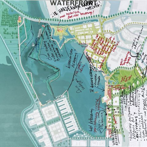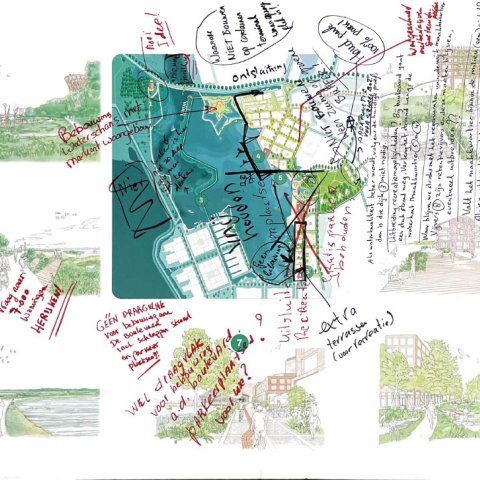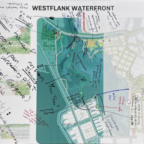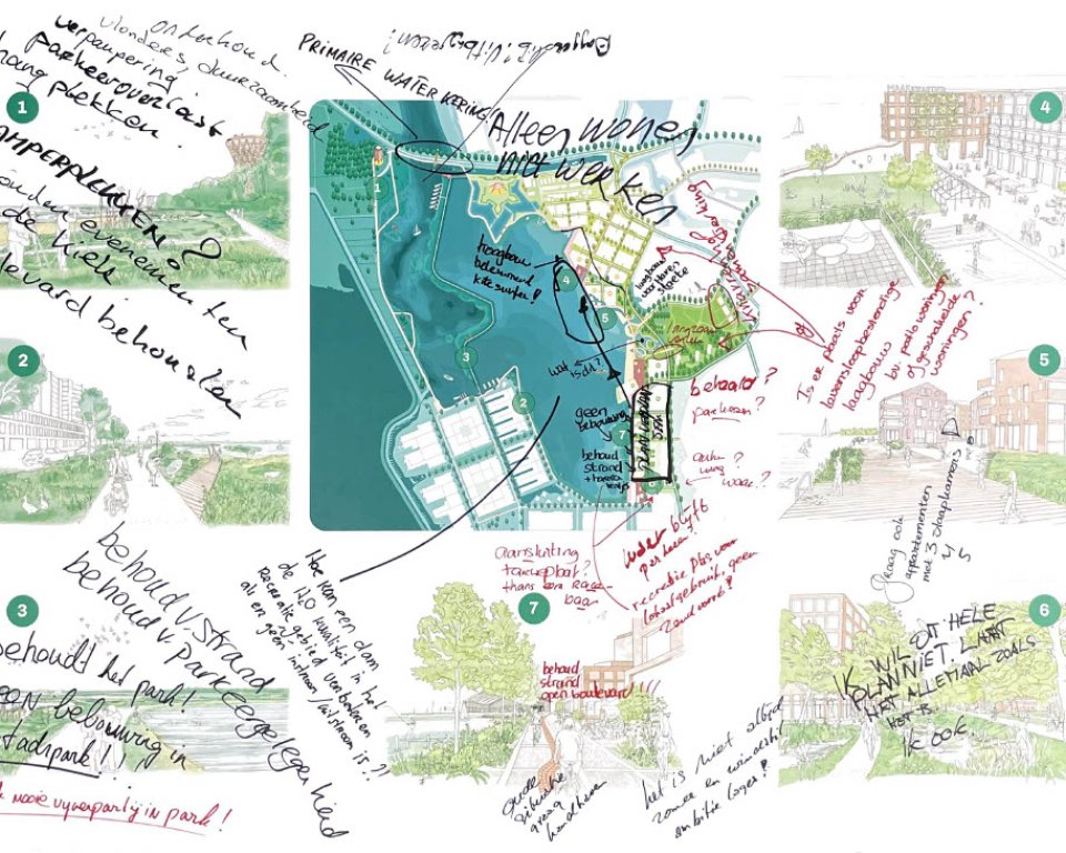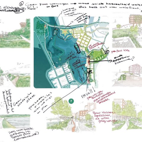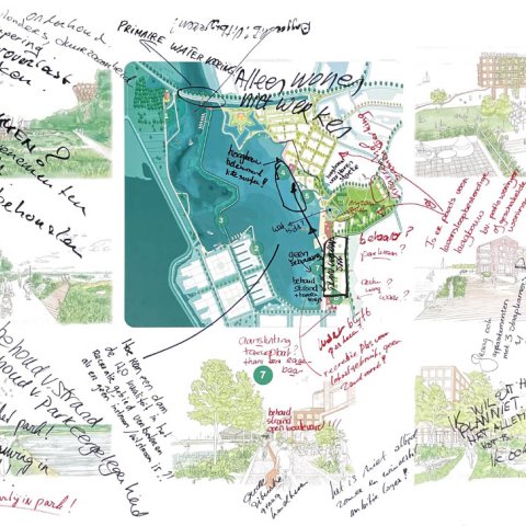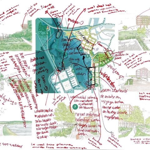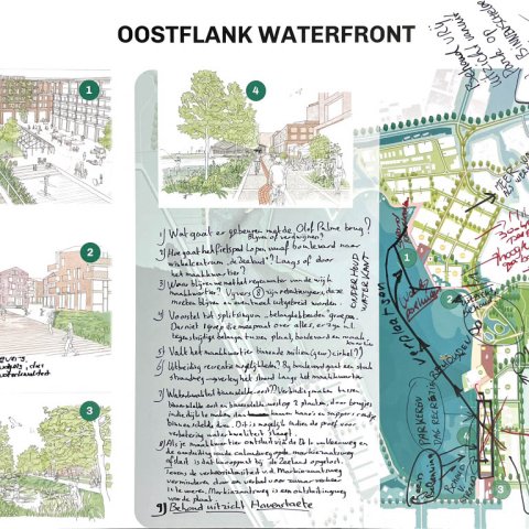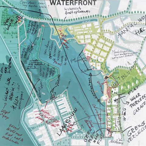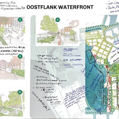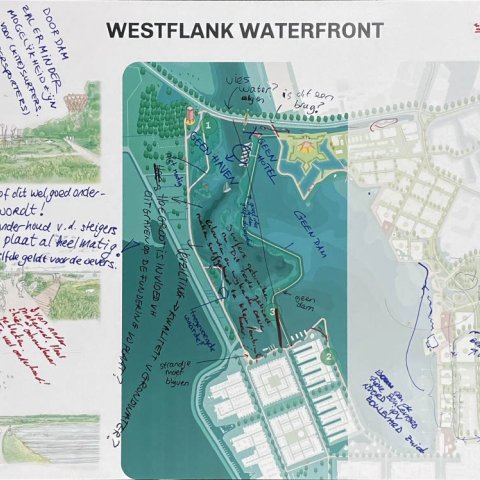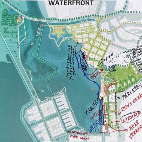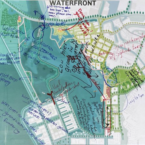 Op 18 november gingen zo’n 80 mensen in kleinere groepen in gesprek. Op grote tekeningen schreven ze hun ideeën, wensen en zorgen op over de oost- en westkant van Waterfront. U kunt deze tekeningen hieronder bekijken.